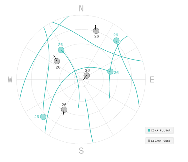 Operating 20x closer to Earth, Pulsar satellites traverse across the sky far more rapidly in the same time period, resulting in additional measurements that help differentiate between real signals and reflected signals