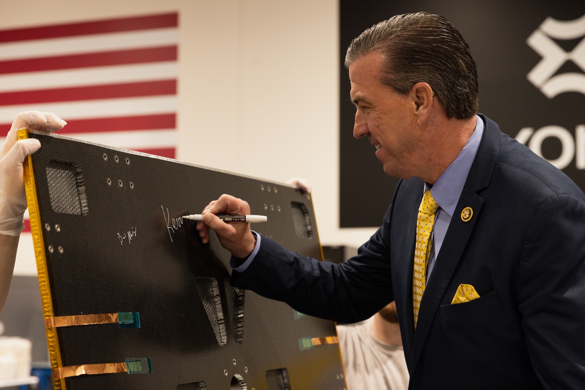 Congressman Kevin Mullin signs a solar panel that will be apart of the first Pulsar satellite built in Burlingame, launching this October.