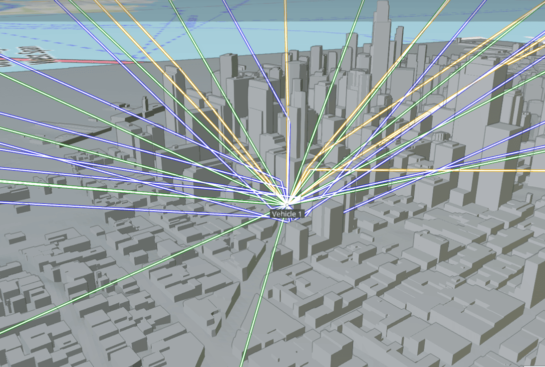 With simulators, device manufacturers and customers are able to visualize the value of Pulsar in real-world scenarios, like navigating in dense cities. Pulsar's faster orbital motion helps receivers distinguish reflections. Simulators, like this instance from Spirent, show where satellite signals are blocked (orange) or reflected in the form of multipath (blue), where only some maintain direct line of sight (green).